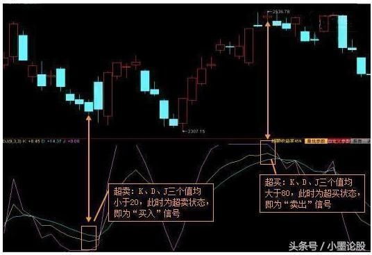 1、超买区:K、D、J这三值在20以下为超卖区,是买入信号。