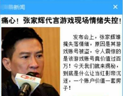 不过,即使是以简单直接而著称的页游广告,也会踩上不少的雷区。一些页游公司为了获取噱头,会发出一些明星玩某游戏时的惊爆“新闻”,如“XXX价值百万游戏账号被盗”、“XXX游戏装备价值已突破百万”等等,其信息准确度则令人质疑。而网上曾热传的“少年组队吴京月入百万”的新闻,后被网友发现只是一名粉丝在社交媒体上发布的与吴京合影。