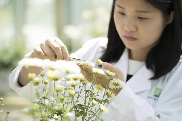 安利(中国)植物研发中心科研人员在采集菊花样本