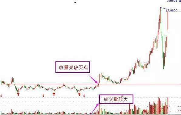 形态特征:大盘或是个股在长时间下跌之后,会有一个横盘整理的状态,让K线形成一个箱体,当底部在箱体右侧成交量逐步放大,最终突破箱体顶部的时候就是大胆买进的时候。