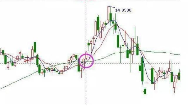 形态特征:个股在大幅下调之后,反弹拉升然后出现缩量回踩,这时候如果5日均线和10日均线以及40日均线出现三线汇聚,形成金叉,出现再次上攻的迹象,那么就是大胆买进的时候。