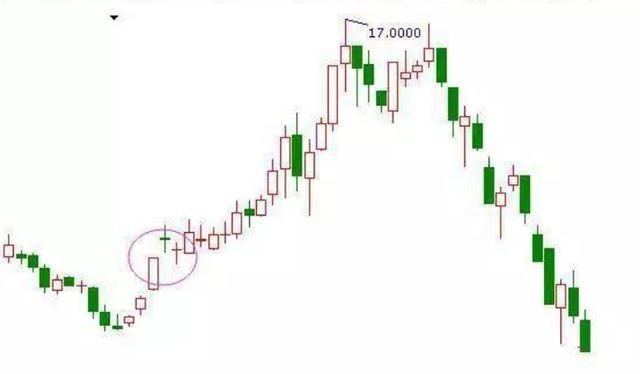 形态特征:当个股在经历长期下调之后,在回升的之后放量出现一根大阳线,之后连续出现三个不断向上的小阳线或是十字星,这表示后市的上涨可能很大,可以立即买进。