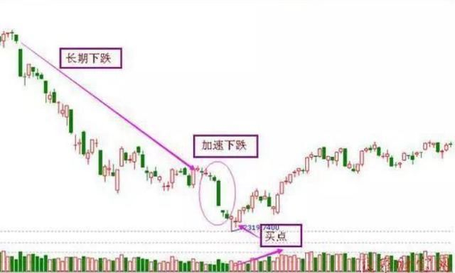 形态特征:大盘或是个股在经历长时间的下跌之后,会突发的出现下跌加速,而后成交量则连续的增长,这时候就是大胆买进的时机。