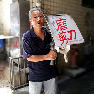 我们在一家旧院子追上了武大叔。旁边围了两个大妈和一个小孩。其中一位六十岁左右的大妈向武大叔问价:“多少钱,磨一个刀?”武大叔把板凳从肩头卸下来,摆在她家门外。武大叔坐在板凳上说:“不一样的,要拿来看看。”