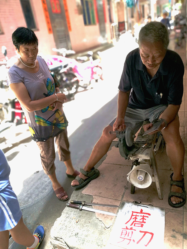 我不明白磨刀跟儿子没回有什么关系。我笑了笑说:磨个刀怕什么。大妈说:儿子没回,他会骂我!武大叔跟旁边另一位大妈解释:她还没听明白,她拿五块,别人出三块。武大叔又对大妈说:只要五块,磨不磨?