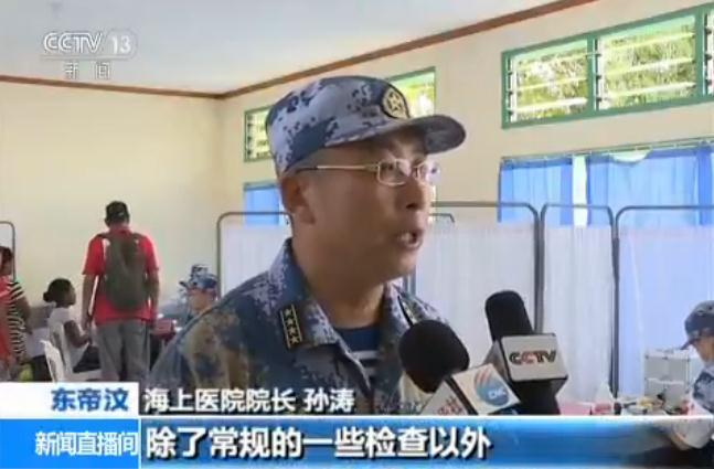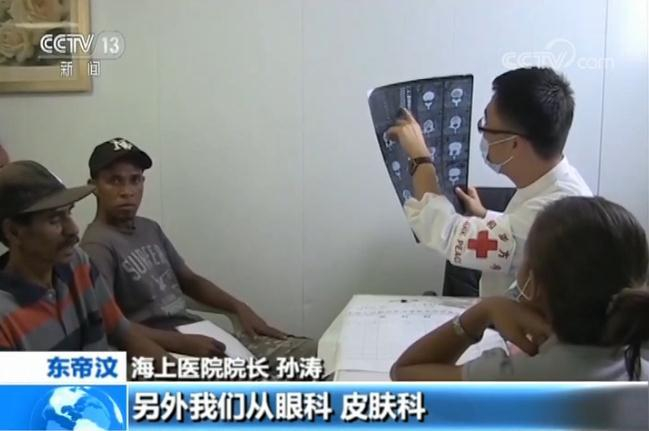 海上医院院长 孙涛:除了常规的一些检查以外,包括我们携带了超声、心电图以及中医,另外我们从眼科、皮肤科、儿科、妇产科、内科、外科都相应的(配备了)一些专家,给当地的居民提供医疗服务。