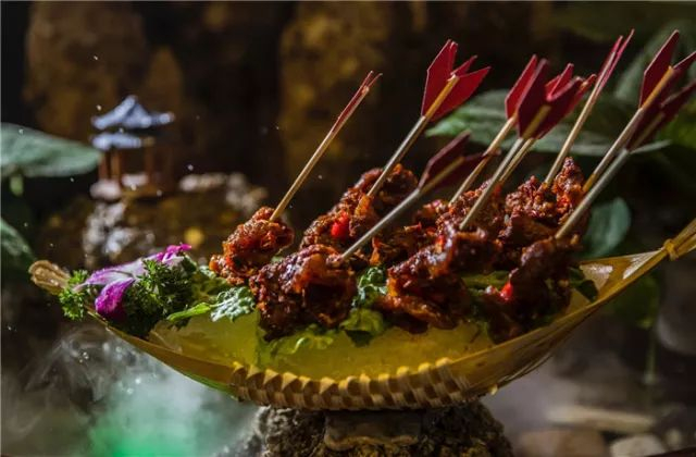 比如这道“草船借箭”,菜如其名,草船上插满了箭,箭梢上的牛肉紧紧包裹着中间的泡椒。
