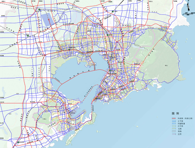 中心城区及外围区域规划形成“区域一体、高快衔接、六横九纵、环湾放射”的高快速路网络。