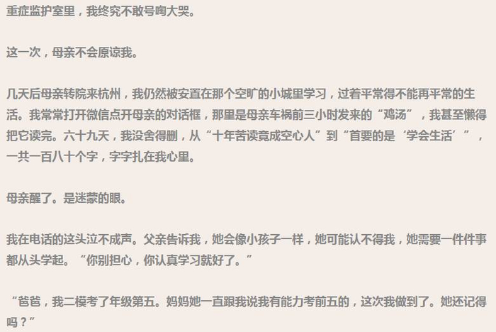 其实,在爸爸眼里,女儿是非常懂事又很聪明的孩子。“我们农村人,我和她妈妈都没多少文化,从来没给她上过什么辅导班。但是她从小成绩就非常好,考上重点中学,名次还非常靠前。写文章和阅读也是很喜欢的,小时候只要是有字的东西,一张报纸她也会翻来覆去看。”