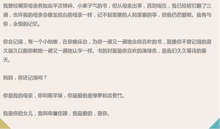 认不出眼前活生生的女儿,但是母亲脑海里依然记挂着女儿,她会对着面前的女儿说,“佳颖读书不认真。”每当这时候,女儿都泪流满面。