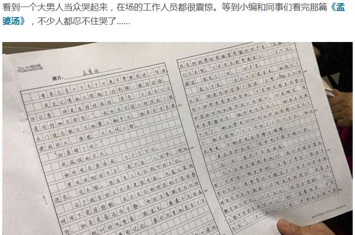然而,总决赛现场却发生了意外的一幕——一位在考场外等待的父亲,一眼认出了女儿的笔迹,他默默瞟了几眼文章,当场泪奔了。