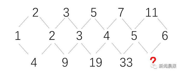 比方说,考试中有这样一道题:有五个圆圈从左至右排列并连接,每个圆圈上下左右各有四个数字,其中右边的数字为临近圆圈左边数字,按上下左右顺序排列四个数字,第一个圆圈为2、4、1、2,第二个圆圈为3、9、2、3,第三个圆圈为5、19、3、4,第四个圆圈为7、33、4、5,第五个圆圈上左右为11、5、6。