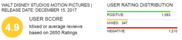 然而,电影公映之后,局势却发生了出人意料的逆转。全美各地的星战迷满怀憧憬的走进电影院,但结束时却面面相觑一脸懵。接着各大电影评分网站上,《星战8》的观众评分开始雪崩般的下滑,同样是在“烂番茄”网站,在光芒万丈的影评人打分旁,网友观众给出不到60的分数,格外刺眼。而观众评论里,褒贬评价的分布呈现出一个两极分化的C形:好评和差评几乎各占一半,一般的评价反而相对稀缺。