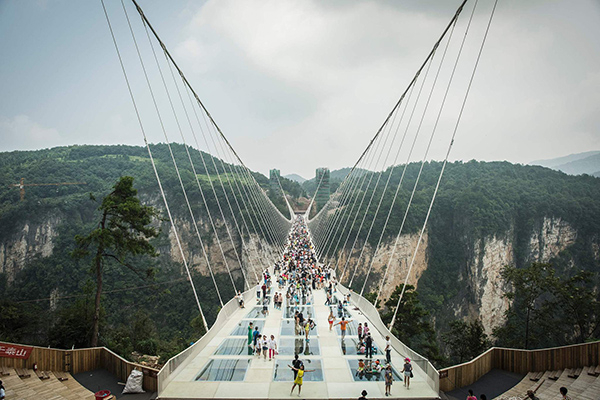 玻璃天桥两头是悬崖峭壁,通过悬索拉起了主跨达400多米的玻璃桥,桥面距离谷底高达300多米。在现代建筑技术发展前,这里交通阻塞程度可想而知。《宋史》中提到西南溪峒地区,仍然说“西南诸蛮夷,重山复岭,杂厕荆、楚、巴、黔、巫中,四面皆王土。”