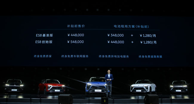 近日,备受关注的蔚来ES8在京正式上市并开启预订。基准版补贴前售价人民币44.8万元,限量1万辆的创始版补贴前售价人民币54.8万元。用户也可以选择电池租用方案,车价比常规购买低10万,每月支付1,280元。提供换电模式、配备全球首个车载人工智能系统“NOMI”是该车的两大亮点。