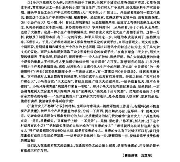 还比如,徐占琨论文在“在通讯和杂文的边缘上”一节中,其中一段写道:“在《‘皇帝女儿不愁嫁’小议》(《人民日报》一九七九年一月十七日)的材料,也可以写成一篇批评性的工作通讯,标题叫《决不能忽视产品质量》,批评几个产品质量差的单位,分析一下原因,提出解决方法。但那样一来,就毫无味道。我尝试运用杂文形象性的议论方法,把质量低劣的缺门货比喻为‘皇帝女儿’,‘其显著特点是:一是丑,质量低劣,‘豆腐渣子上船——不是货’;二是俏,很吃香,‘你不要,别人抢,过了这个村就没有这个店!’’把制裁劣质货的办法比喻为‘打皇帝女儿’:‘难道就没有办法对付这类‘皇帝女儿’吗?我们议论了很久。谈到《打金枝》这出戏,就是打皇帝的女儿。皇帝的女儿有了过错可以打,缺门货质量低劣也应当受到经济制裁……’这样就比较生活活泼,新颖别致,读者反映比较好。”