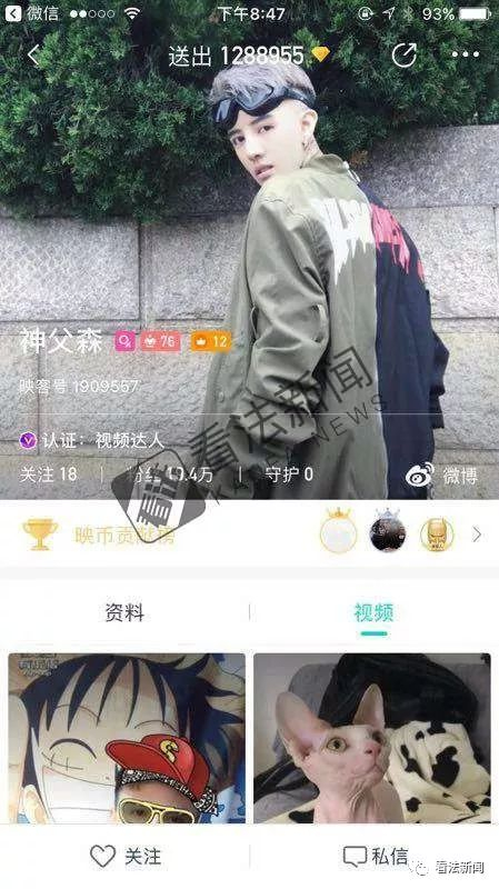 “神父森”认证为视频达人,长得像吴亦凡,有近20万粉丝。他手臂脖颈都有文身,主页上有一段表达对粉丝感谢的说唱,小雅在他的映币贡献榜上排名第二。