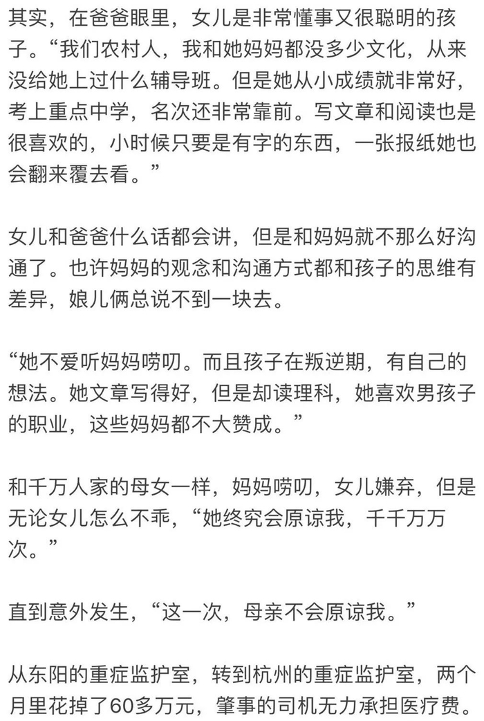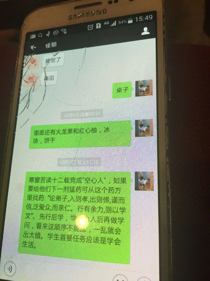 几天后母亲转院来杭州,我仍然被安置在那个空旷的小城里学习,过着平常得不能再平常的生活。我常常打开微信点开母亲的对话框,那里是母亲车祸前三小时发来的“鸡汤”,我甚至懒得把它读完。六十九天,我没舍得删,从“十年苦读竟成空心人”到“首要的是‘学会生活’”,一共一百八十个字,字字扎在我心里。