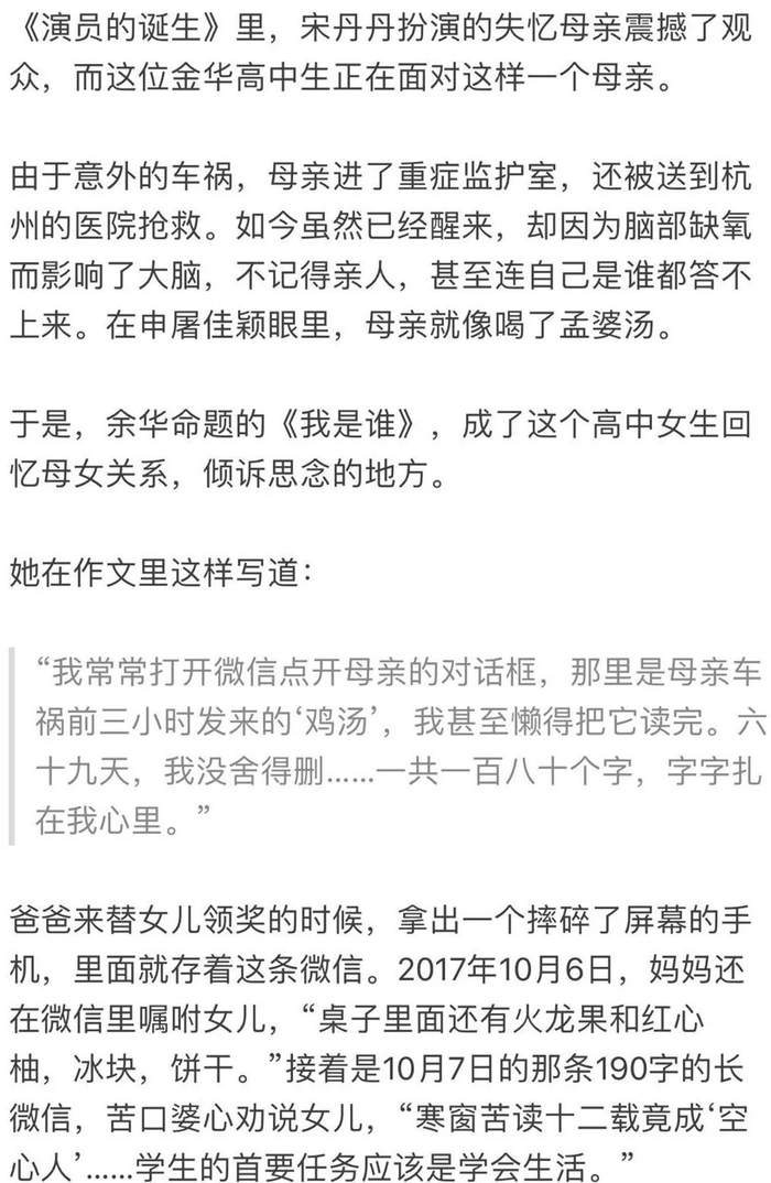 这份字迹秀丽得宛如印刷的稿卷,出自浙江金华市东阳中学高二(16)班申屠佳颖之笔。在阅卷过程中,这篇文章同样打动了作家余华、毕飞宇、叶兆言等人,成为高中组一等奖作品。