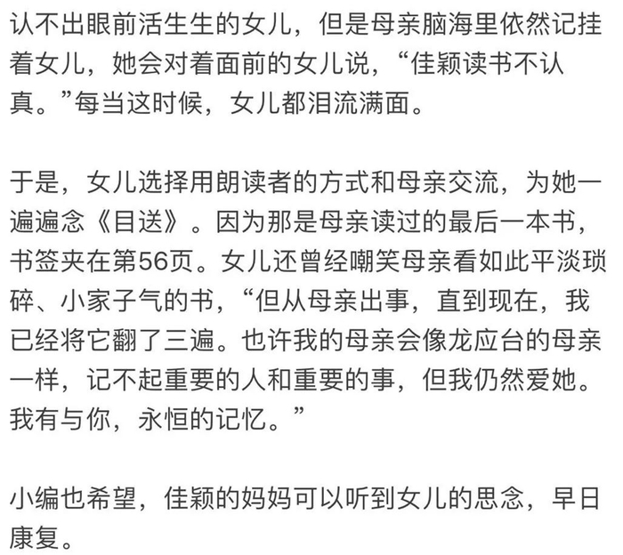 我忽然想起我的包里有一本《目送》,那是母亲读过的最后一本书,她的书签夹在第五十六页。我曾经嘲笑母亲看如此平淡琐碎、小家子气的书,但从母亲出事,直到现在,我已经将它翻了三遍,也许我的母亲会像龙应台的母亲一样,记不起重要的人和重要的事,但我仍然爱她。我有与你,永恒的记忆。