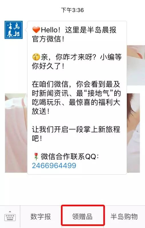 2.进入半岛晨报微信公号,点击菜单栏“领赠品”