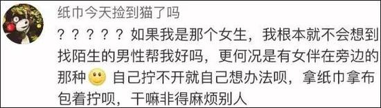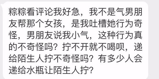 网友周黑鸭:内个女生也没说男朋友啊,只是说内个女生很奇怪吐槽一下,你们为什么说她啊可能在我这个大力猪猪女孩看来确实也奇怪,而且我不会找不认识的人拧瓶盖啦,大不了暂时不喝或者自己努努力啦(自己看法而已不代表其他妹子)