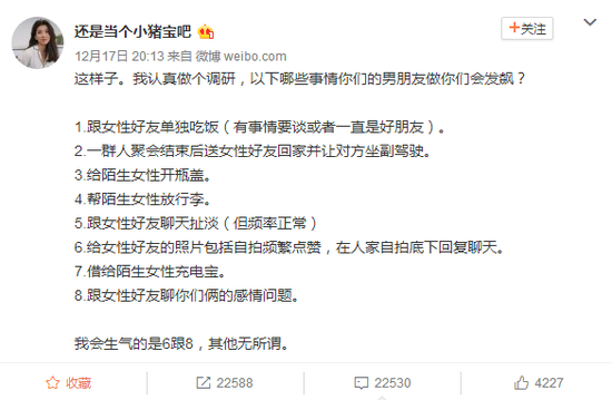 正反双方的观点和事情的对错,君不予置评,毕竟大家争了两天也没谁能说服谁,也正因为这样,有博主还做了个调研,研究一下妹子们对男朋友做下列哪些事情会发飙。