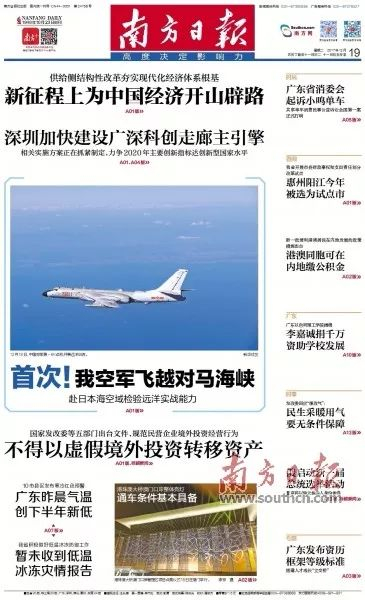 ▶18日,中国空军出动轰炸机等多型多架战机,飞越对马海峡赴日本海国际空域训练,这是中国空军首次飞越对马海峡。
