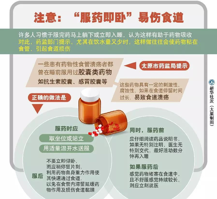 日前,药监部门提示,服完药马上躺下或立即入睡,尤其在饮水量又少时,这样做往往会使药物粘在食管,引起食道损伤。