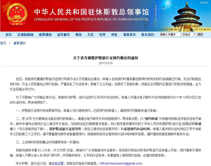 中国驻休斯敦领馆护照旅行证预约号遭人恶意抢占