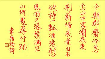 韦应物,长安(今陕西西安)人。出身世家大族,15岁起为玄宗近侍,出入宫闱,扈从游幸。为富家无赖子弟,横行乡里。23岁开始折节读书,痛改前非。历任滁州刺史、江州刺史、苏州刺史,官至从三品。世称世称韦江州、韦左司、韦苏州。其诗多写山水田园,清丽闲淡,与柳宗元并称“韦柳”。