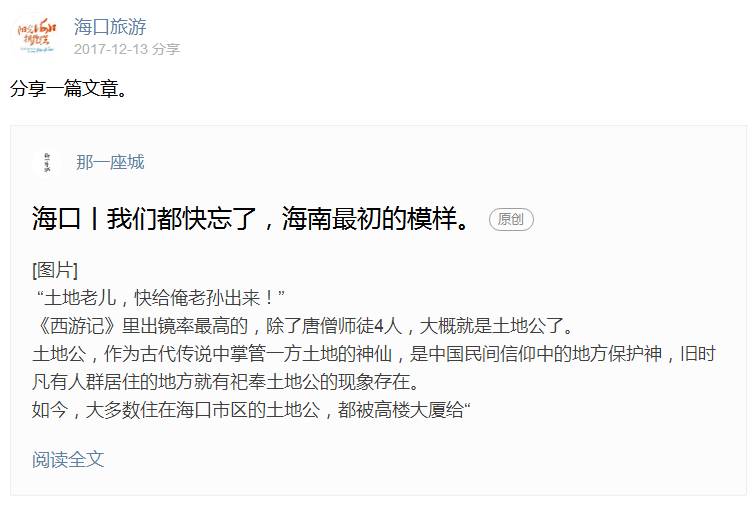 而“海口旅游”则用了这样一个功能,给大家分享了一篇文章。使得能够把好文推荐给网友,也保护了原作者的原创,自己的流量也上去了。荐文分享,也不失一个好方法~这篇文章开头用了《西游记》里“土地公”的桥段做引子,带大家重寻海南千年历史印记。古街老巷之间,昔日繁华若隐若现,而年轻人用他们的方式,将这些历史、故事继续传承……喜欢深挖海南历史,徒步摄影的朋友,这篇文章值得你细细品味!