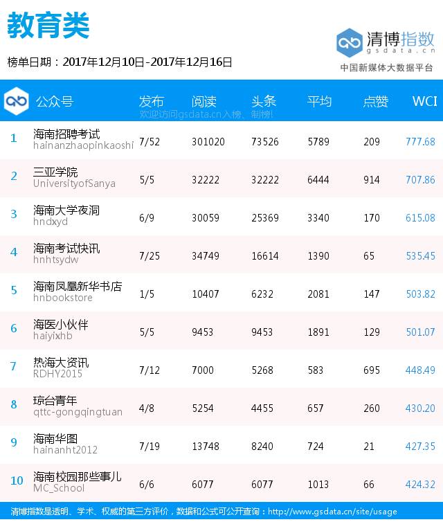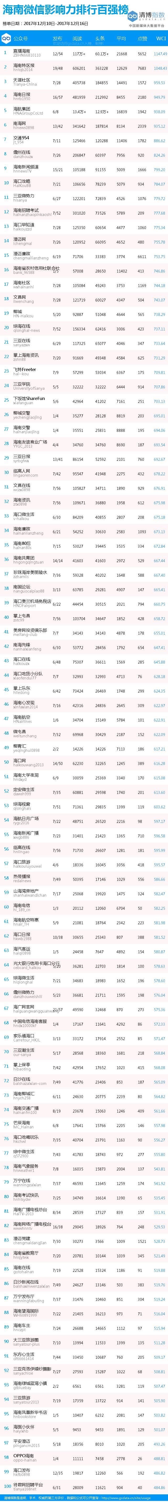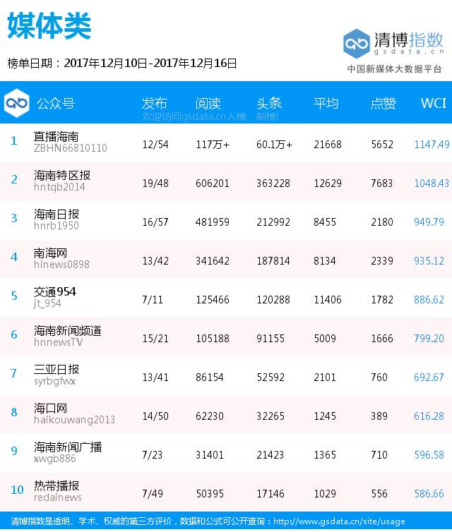 “海南微信影响力排行榜”由南海网新媒体联合清华大学新闻研究中心权威发布。本榜单数据来源于第三方平台新媒体指数大数据平台http://index.xuetang.cn/,南海网新媒体仅整理发布,如若因第三方平台等任何原因出现数据错误现象,本网对其概不负责,亦不承担任何法律责任。