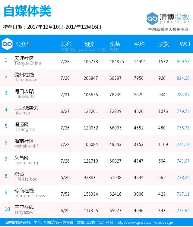 本周自媒体类榜单前三名:天涯社区、儋州在线、海口攻略