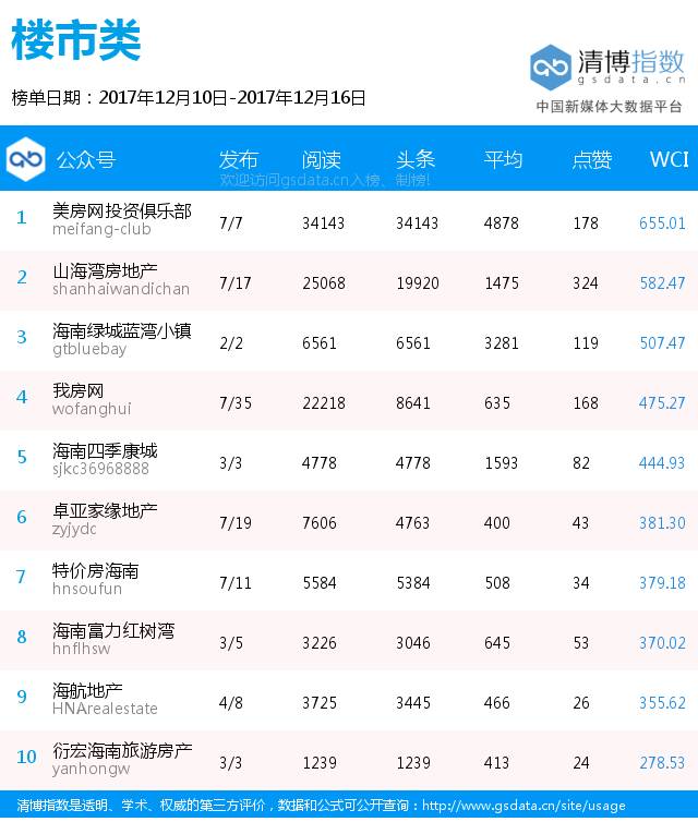 本周楼市类榜单前三名:美房网投资俱乐部、山海湾房地产、海南绿城蓝湾小镇