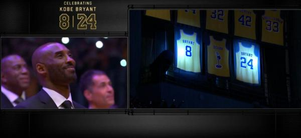 当8号和24号两件紫金球衣缓缓升上斯台普斯中心球馆的上空,科比也成为了NBA历史上唯一一位在同一支球队同时退役两件球衣的球员。