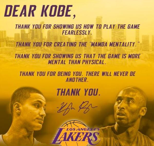 亲爱的科比,谢谢教会我们无畏的打球,谢谢你创造了曼巴精神,谢谢你告诉我们,篮球是精神高于天赋。谢谢你的出现,不会再有另一个你。谢谢你!