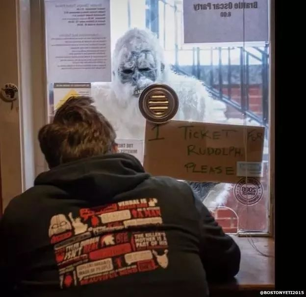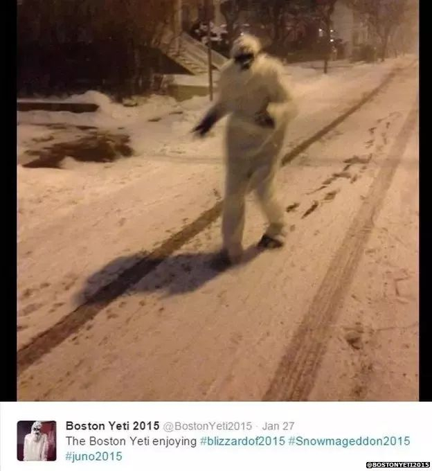 2015年,在波士顿下起第一场暴风雪的时候,一个不明身份的人士穿了这么一身雪人装满波士顿乱跑…