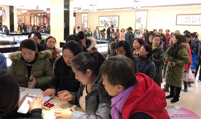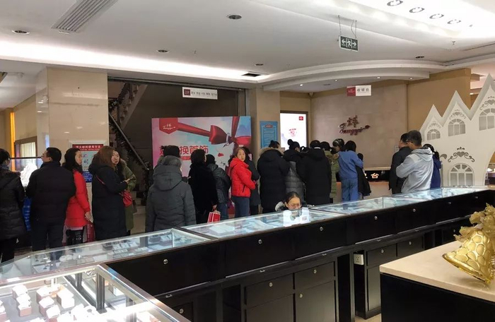 图为宏艺珠宝柳溪店“鸡蛋换首饰”排队场景
