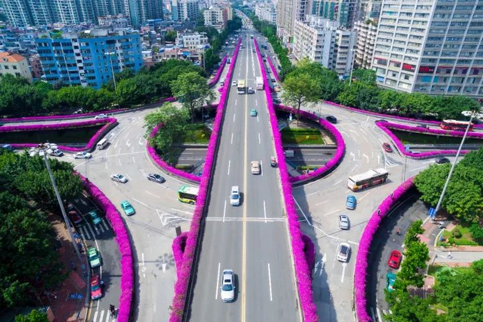 盛放的簕杜鹃为客村立交“描”了一条条紫红边线。广州日报记者邱伟荣 摄