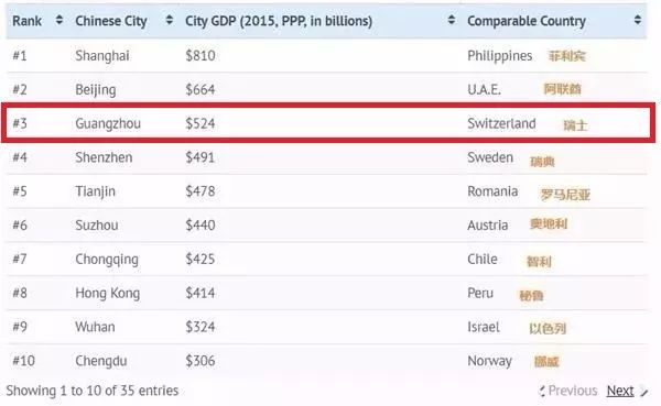 比如上海的GDP就和菲利宾旗鼓相当,北京的GDP和阿联酋不分上下,广州的GDP则相当于整个瑞士的GDP。