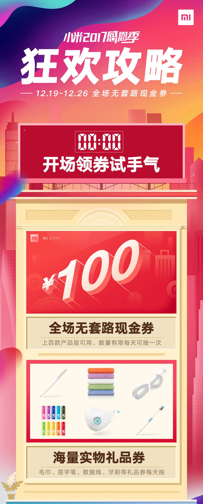 小米将送出100万张100元、100万张50元全场无套路现金券,除秒杀、运费、虚拟产品及有品专区商品外,可在小米商城购买任意产品.无门槛!无套路!