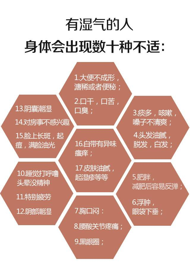 ①大便不成形,溏稀或者便秘;②口干,口苦,口臭;③痰多,咳嗽,嗓子不清爽;④头发油腻,脱发,白发;⑤肥胖,减肥后容易反弹;⑥浮肿,眼袋下垂;⑦腰酸关节疼痛;⑧胸口闷;⑨黑眼圈;⑩睡觉打呼噜;⑪头晕没精神,特别疲劳;⑫阴部潮湿;⑬阴囊潮湿;⑭对房事不感兴趣;⑮脸上长斑,起痘,满脸油光;⑯白带有异味,瘙痒;⑰皮肤油腻,起湿疹等等。