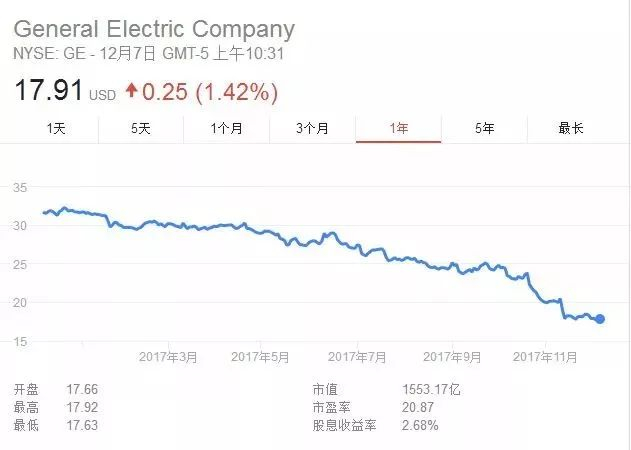 通用电气股价在周三跌至六年以来的最低点,在周四盘前的交易中,其股价暂报17.77美元。