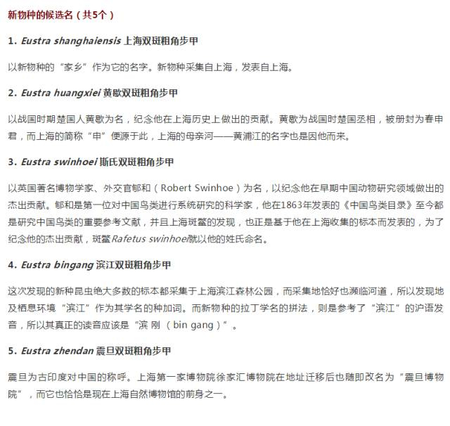 宋晓彬介绍,对外公开征集的新名字共有5个,除了上述两大“热门”以外,还有黄歇双斑粗角步甲(Eustra huangxiei)、斯氏双斑粗角步甲(Eustra swinhoei)、震旦双斑粗角步甲(Eustra zhendan)。这些名字都有一个共同点:和新物种的家乡——上海有关,希望通过名字让全世界的昆虫爱好者一看就知道它们来自上海,而票选的结果为上海双斑粗角步甲,很好地体现了这一特征。