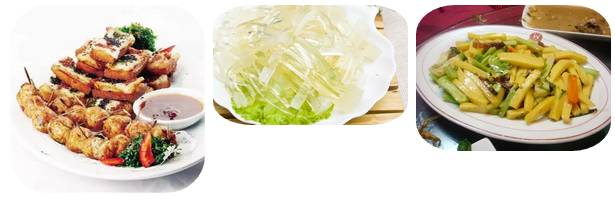 比较有特色的瓯菜佳肴有:马铃黄鱼、顺溪黄年糕、炸蛏子筒、蒜子鱼皮等。湖岭牛排 、楠溪麦饼、矾山肉燕、陡门头灯盏糕、文成黄坦糖、温州冻胶等则都是当地有名的小吃。