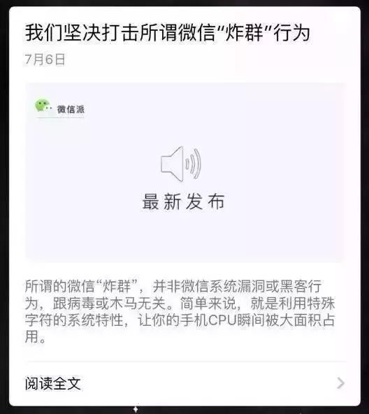 所谓“炸群”,是指利用代码或手动在微信群内集中发布大量垃圾信息,瞬间加重手机 CPU 负荷,导致其他用户无法正常使用微信或手机,但这并非系统漏洞或黑客行为。