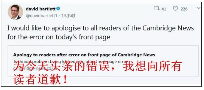 确实,主编David心情很复杂,并在推特和剑桥新闻的官网上,为这一“技术错误”向读者们道歉: