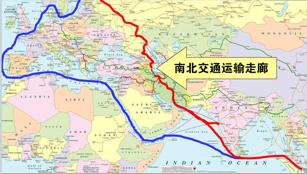资料图片:图为俄、伊、印三国联合规划的南北交通运输走廊。(图片来源于网络)