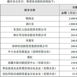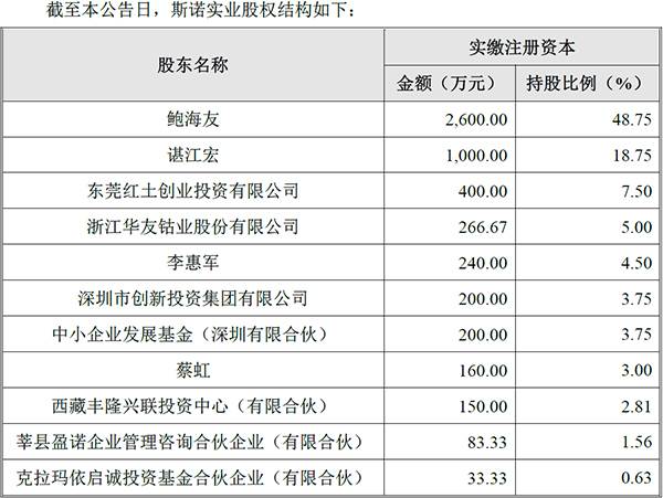 按12月19日公告,斯诺实业的法定代表人为鲍海友,注册资本为5333.3333万元。鲍海友是最大股东,持股比例为48.75%,谌江宏以18.75%的持股比例,位列第二大股东。此外,该公司的股东,还包括东莞红土创业投资有限公司、深圳市创新投资集团有限公司、中小企业发展基金(深圳有限合伙)等有国资背景的投资机构,以及上市公司浙江华友钴业股份有限公司。